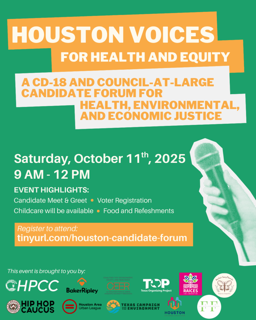 Join Bayou City Waterkeeper, as part of the Houston Healthy Ports Community Coalition (HPCC) and community partners including the Houston Area Urban League, Hip Hop Caucus, Texas Campaign for the Environment, BakerRipley, CEER (Coalition for Environment, Equity, and Resilience), Greater Houston Coalition for Justice, Texas Organizing Project, Denver Harbor Cares, Pleasantville Community, and other grassroots organizations: we invite you to join us in an upcoming community Candidate Forum for Health, Environmental, and Economic Justice, for City of Houston At-Large Council and Texas Congressional District 18 candidates, scheduled for: