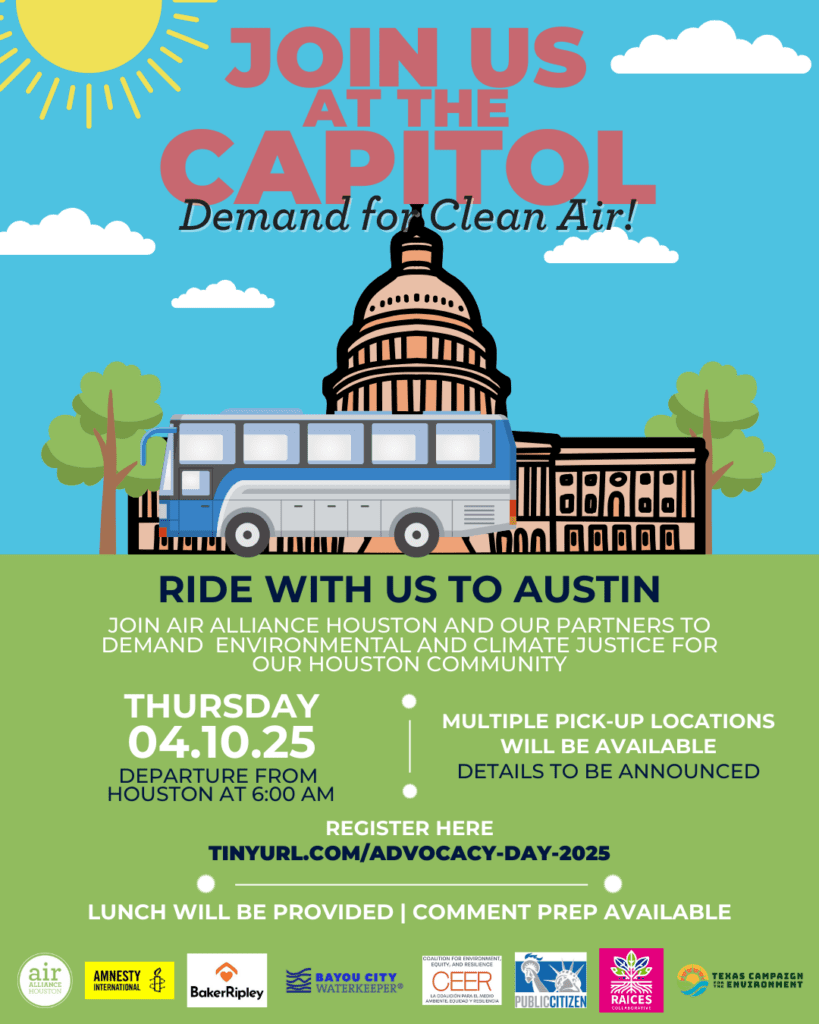 Únete a Bayou City Waterkeeper y a nuestros socios locales en nuestro Día de Defensa de la Justicia Ambiental en Houston, en el Capitolio Estatal de Texas. Juntos, nos reuniremos con legisladores estatales para debatir las preocupaciones sobre el agua y el medio ambiente que afectan a nuestra región. Esta es tu oportunidad de influir directamente en las políticas y exigir acciones en favor del agua, compartiendo con los legisladores los temas que más te preocupan y apoyando las demandas políticas de BCWK para la 89.ª Sesión Legislativa de Texas.